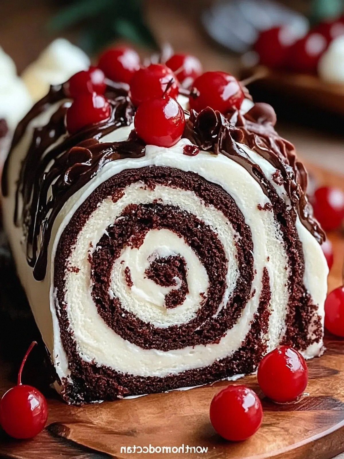 The finishing touches—whole cherries, chocolate curls, and a dusting of powdered sugar—transform the roll from a simple dessert into an edible work of art. The whole cherries act as bright, juicy accents that contrast with the dark chocolate. Chocolate curls add a touch of elegance and a hint of bitterness that balances the sweetness. A light dusting of powdered sugar gives the roll a finished, professional look.